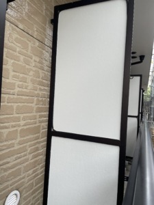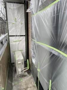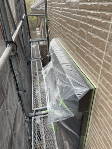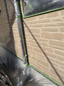 次に養生になります。ペンキで汚さないように窓廻り・ベランダ・玄関廻り・その他などにビニールを貼ります。仕上がりにも影響が出る大事な作業になります。