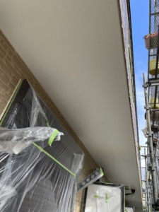 次に軒裏・パーテション塗装になります。シーラー下地のウレタン塗料2回塗りの計3回塗りのオフホワイト仕上げになります。