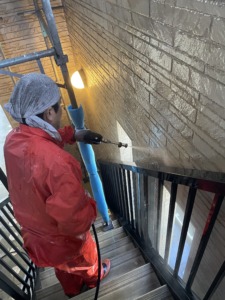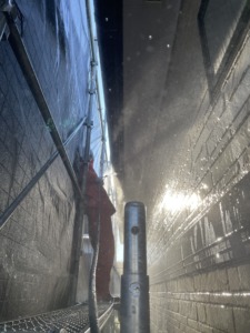 さて、Eアパートも高圧洗浄から始まります。外壁などの汚れ・コケをしっかり落とします。
