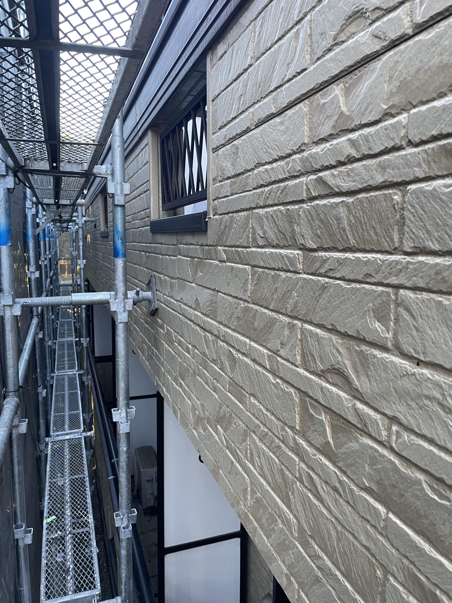 次に外壁塗装の高意匠サイディング塗装の2回目になります。こちらも中塗りと同じUVプロテクトクリヤーをもう一度塗ります。色ムラもなくなり厚みのあるしっかりとした仕上がりになりました。