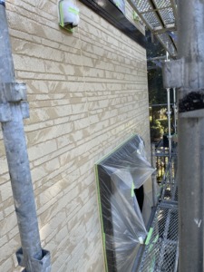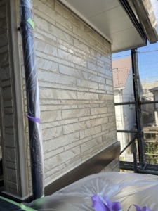 次に高意匠サイディング部分塗装の1回目になります。材料は日本ペイントのUVプロテクトクリヤーを塗ります。現在のサイディングの模様をそのまま残し新築時に近い風合いのまま長期に維持させます。耐久性・超低汚染性・防藻防カビ性などのすべてが整ったシリコン塗料になります。