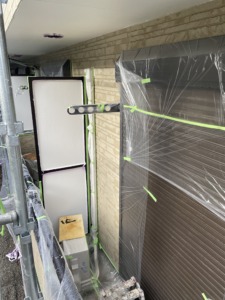 次に養生になります。ペンキで汚さないように窓廻り・ベランダ・植物・その他などにビニールを貼ります。仕上がりにも影響が出る大事な作業になります。