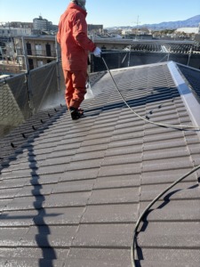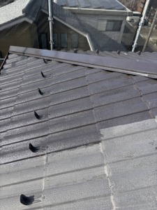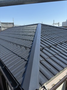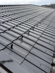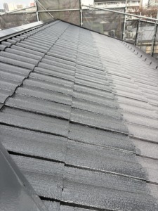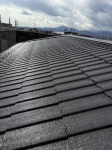 次に屋根塗装の上塗りになります。中塗りと同じアレスクール2液Siをもう一度塗ります。色ムラもなくなり厚みのあるキレイな仕上がりになりました。屋根の色は1番人気のブラック仕上げになります。