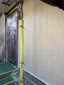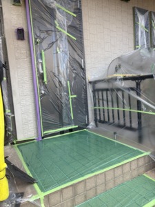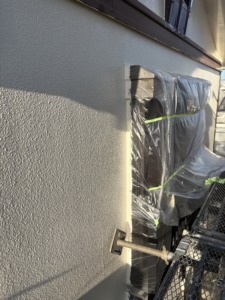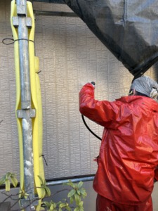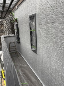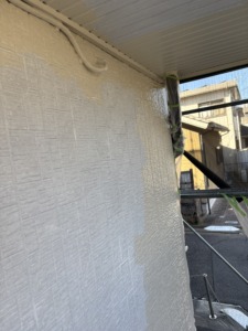 次に養生になります。ペンキで汚さないように窓廻り・ベランダ・植物・その他などにビニールを貼ります。仕上がりにも影響が出る大事な作業になります。次に外壁塗装の下塗りになります。モルタル部分にはモルタル用下地材、サイディング部分にはサイディング用下地材を使い分けて塗ります。