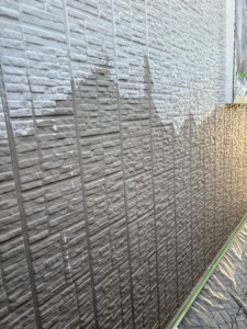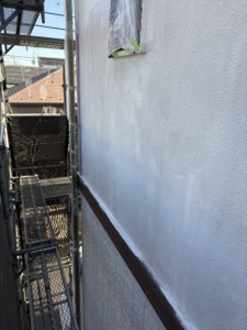 次に外壁塗装の中塗りになります。日本ペイントのパーフェクトトップを塗ります。水性塗料なのでニオイに敏感な人や小さなお子様などにも安心だと思います。耐候性に優れていて低汚染性で雨だれ汚染に対して効果があり防カビ・防藻を有していて高い透湿性により結露から建物を守り落ち着きのある3分艶・艶消し・艶ありなどの艶調整が可能な当社お勧めのラジカル塗料にます。
