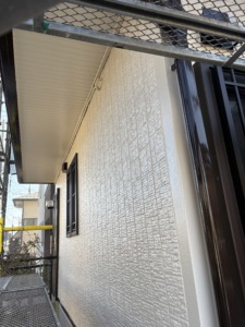 次に外壁塗装の上塗りになります。中塗りと同じパーフェクトトップをもう一度塗ります。厚みのあるキレイな仕上がりになりました。外壁・軒裏共に温かみのあるクリーム色系の艶あり仕上げになります。