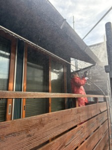 さて、A様邸も高圧洗浄から始まります。外壁・屋根のコケや汚れなどをキレイに落とします。