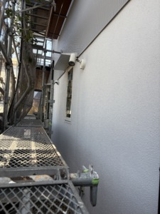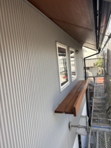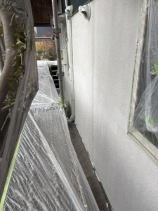 次に外壁塗装の上塗りになります。中塗りと同じパーフェクトトップとコスモマイルドシリコンをもう一度塗ります。厚みのあるキレイな仕上がりになりました。外壁の色は落ち着きあるグレー系の艶消しと三分艶仕上げになります。