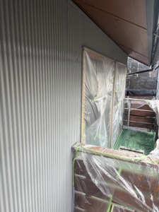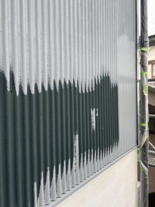 次に外壁塗装の中塗りになります。モルタル部分は日本ペイントのパーフェクトトップを塗ります。水性塗料なのでニオイに敏感な人やペットのワンちゃんなどにも安心だと思います。耐候性に優れていて低汚染性で雨だれ汚染に対して効果があり防カビ・防藻を有していて高い透湿性により結露から建物を守り落ち着きのある3分艶・艶消し・艶ありなどの艶調整が可能な社お勧めのラジカル塗料にます。金属製外壁材部分は関西ペイントのコスモマイルドシリコンを塗ります。耐候性に優れていて低汚染性で防カビ防藻を有している2液型のシリコン塗料になります。2液型とは主剤と硬化剤とを混ぜて使う材料でシンナーを使うので水性塗料よりはニオイがあります。