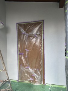 次に養生になります。ペンキで汚さないように窓廻り・玄関・植物・その他などにビニールを貼ります。仕上がりにも影響が出る大事な作業になります。次に外壁塗装の下塗りになります。モルタル部分はフィーラー系下地材、金属製外壁材部分はエポキシ樹脂錆止めを塗ります。特にクラックなどは入っていませんでした。