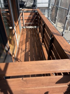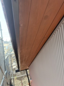 次に木製部分の塗装になります。破風板・軒裏・ベランダ・その他を木材保護塗料のノンロットを色を使い分けて2回塗り仕上げします。