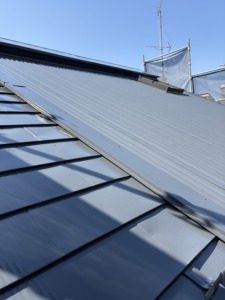 次に屋根塗装の上塗りになります。関西ペイントのスーパーシリコンルーフペイントのグラニットグレー仕上げなります。
