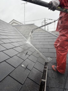 さて、I様邸も高圧洗浄から始まります。外壁や屋根などの汚れ・コケをしっかり落とします。屋根にコケがだいぶ生えていましたのでトルネードノズルを使ってしっかり洗い流します。