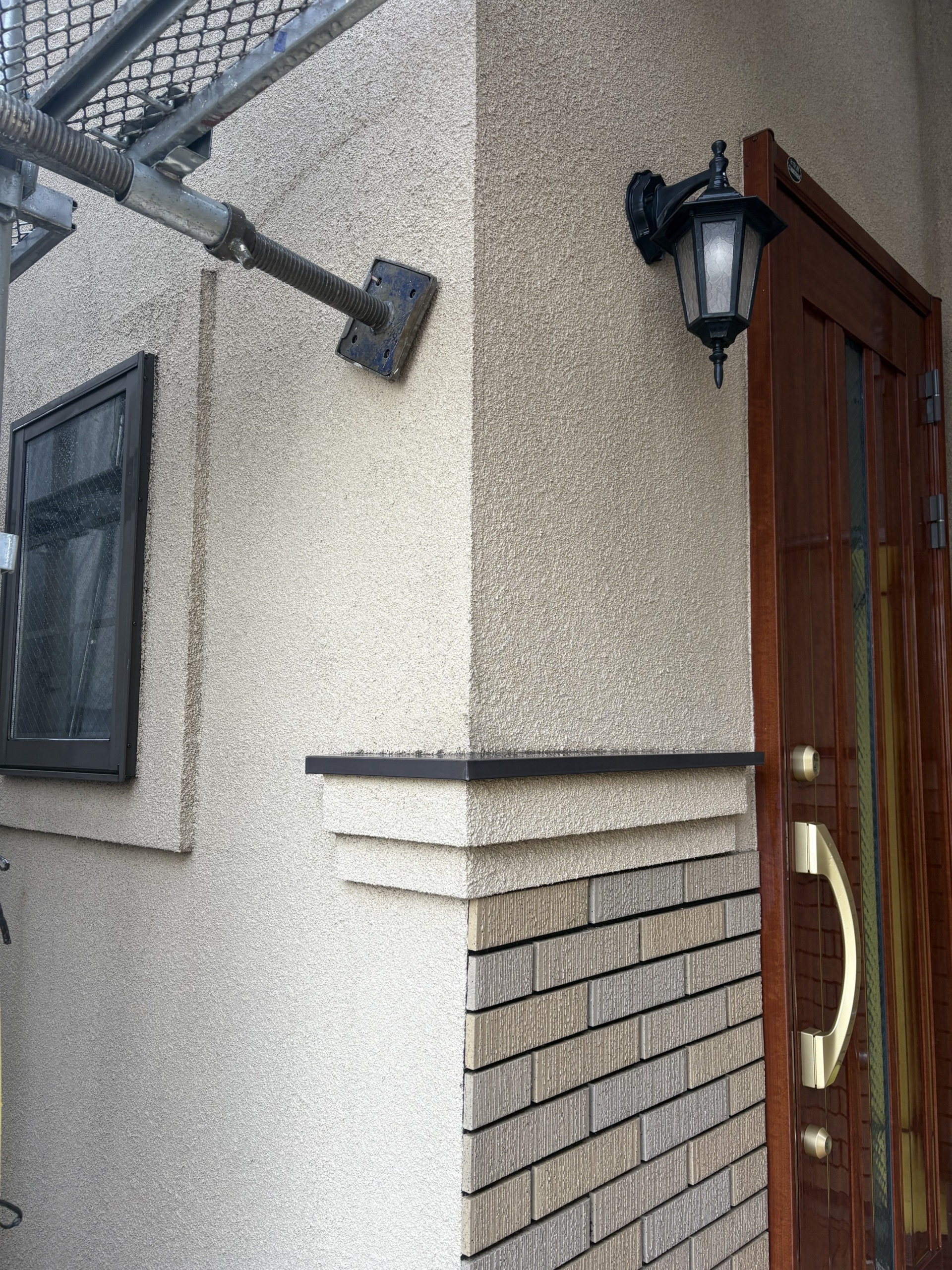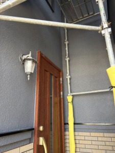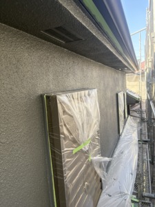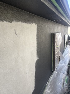 次に外壁塗装の上塗りになります。中塗りと同じパーフェクトトップをもう一度塗ります。色ムラもなくなり厚みのあるしっかりとした仕上がりになりました。外壁の色は今人気のある濃いグレー系の艶消し仕上げなります。