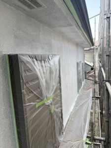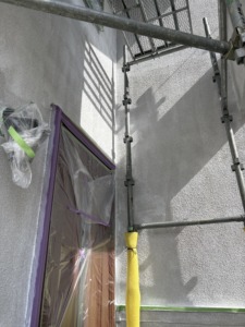 次に養生になります。ペンキで汚さないように窓廻り・ベランダ・植物・その他などにビニールを貼ります。仕上がりにも影響が出る大事な作業になります。次に外壁塗装の下塗りになります。モルタル用のフィーラー系下地材を塗ります。クラックが入っていましたのでその部分は2回、3回と塗りしっかりと埋めます。