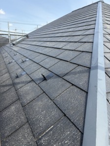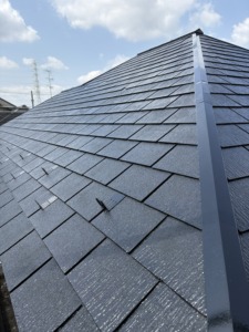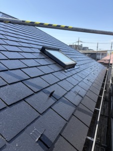 次に屋根塗装の上塗りになります。中塗りと同じアレスクール2液Siをもう一度塗ります。色ムラもなくなり厚みのあるキレイな仕上がりになりました。屋根の色は1番人気のブラック仕上げになります。